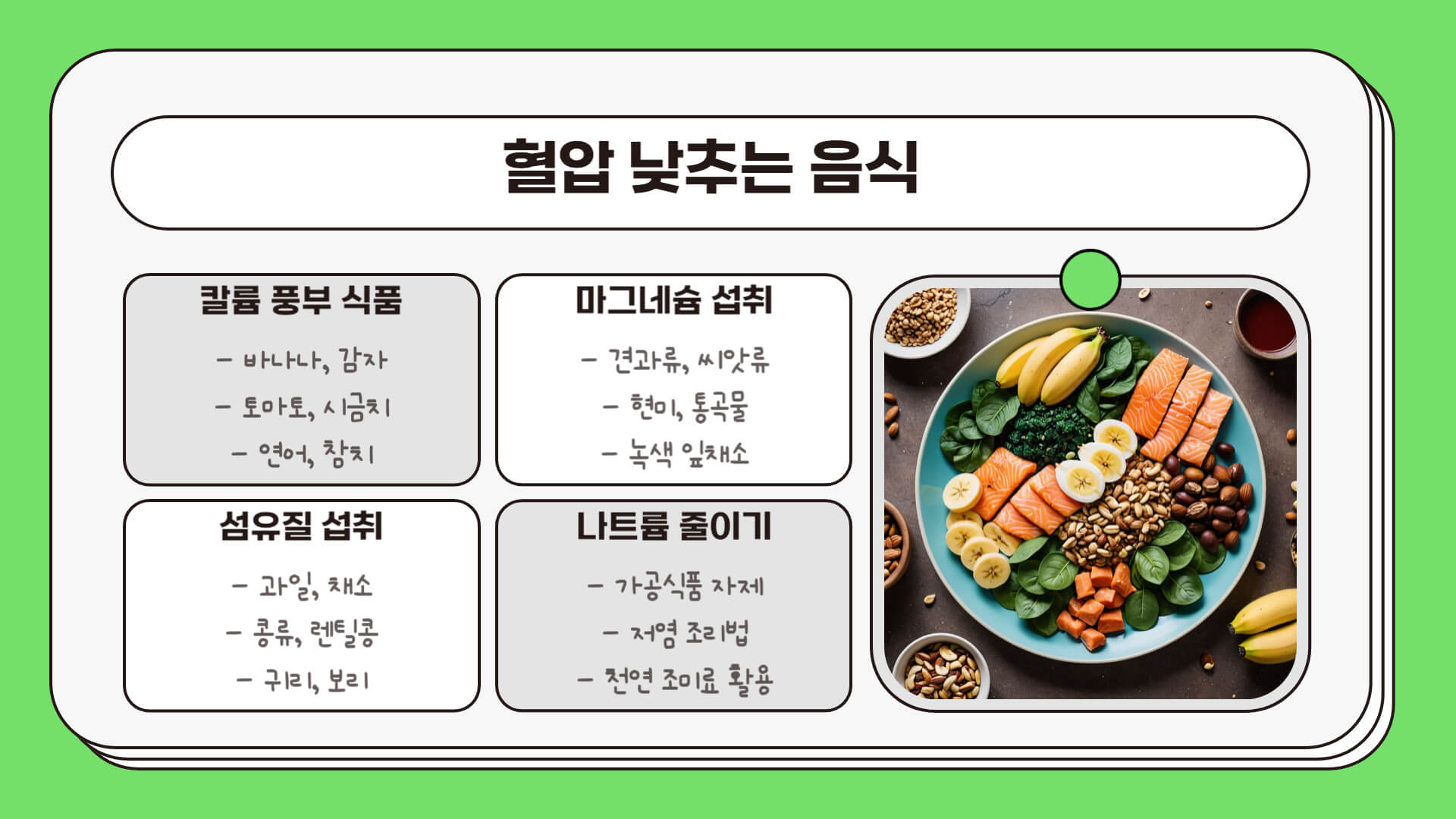 특히 칼륨, 마그네슘, 섬유질이 풍부한 음식을 섭취하면 혈압을 효과적으로 낮출 수 있어요!