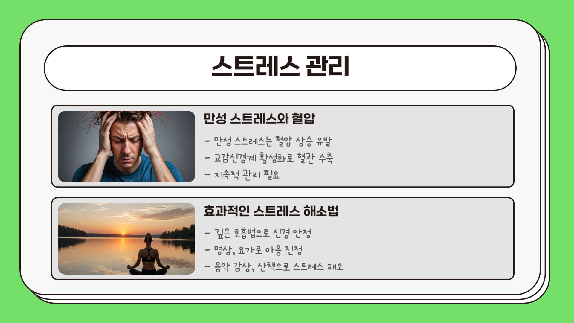 - 깊은 호흡법 🫁 – 복식호흡을 하면 신경이 안정되고 혈압이 낮아집니다.