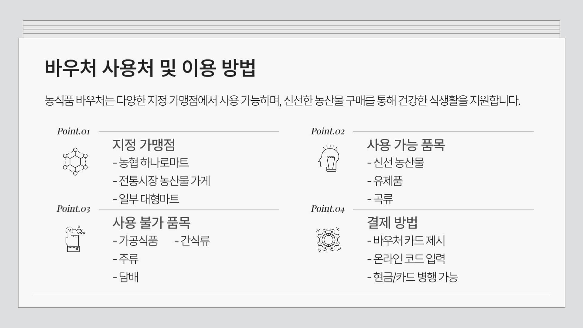 이용 방법은 간단합니다. 결제 시 바우처 카드를 제시하거나 온라인 바우처 코드를 입력하면 자동으로 차감됩니다. 단, 가공식품이나 주류, 기호식품(과자, 음료 등) 구매에는 사용할 수 없습니다.