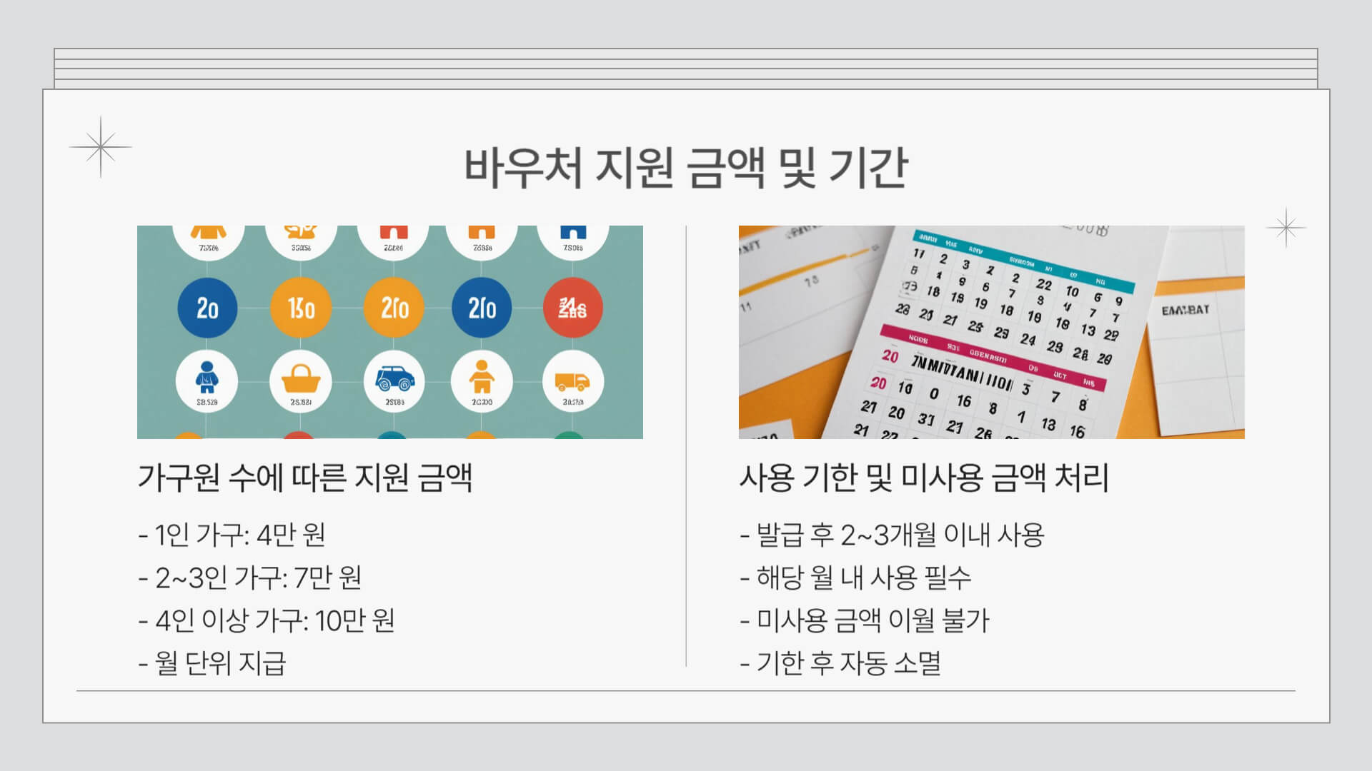 | 가구원 수 | 월 지원 금액 | 사용 기한 |